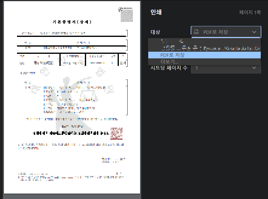 - 증명서 선택: 상세증명서(요구하는 기관에 따라 다릅니다. 저는 은행 계좌 개설 시 상세증명서를 요구하여, 상세증명서를 선택했습니다.)