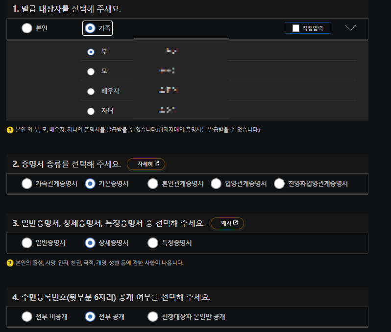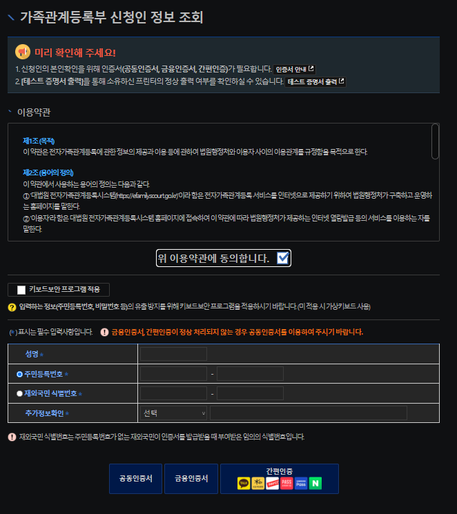- 신청 사유: 개인 신분 또는 가족관계증명