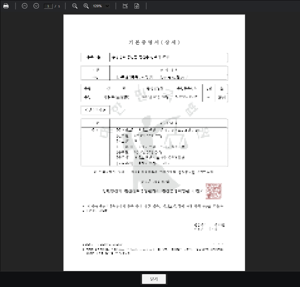 7. <신청하기>를 클릭하면, 아래와 같이 기본 증명서가 뜹니다.