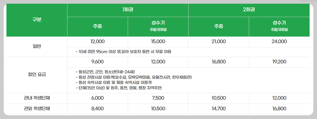 - 휴장일: 12월~2월, 매월 마지막주 화요일(성수기 제외)