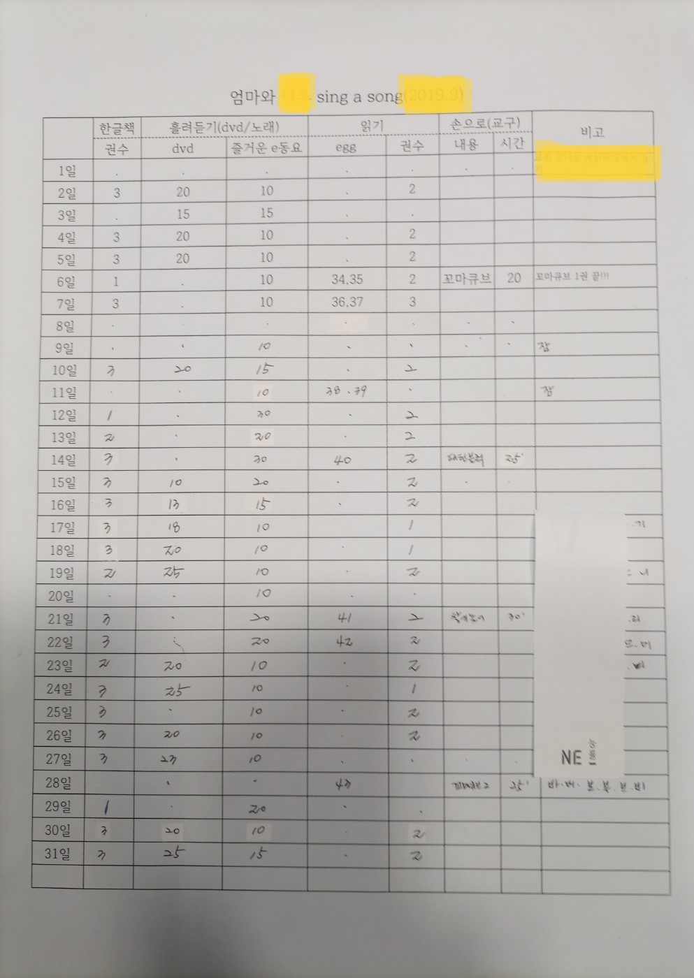 처음에는 주단위도 만들어보고, 엄마표 진행한 상황을 구체적으로 작성해 보기도 했는데, 여기서도 많은 시행착오를 겪었습니다. 진행해 보니 계획점검표가 꼭 필요한 것은 맞는데, 여기에 많은 에너지를 사용할 필요가 없었다는 것을 깨달았습니다. 아직 많은, 대단한 것을 하는 것은 아니기 때문입니다.