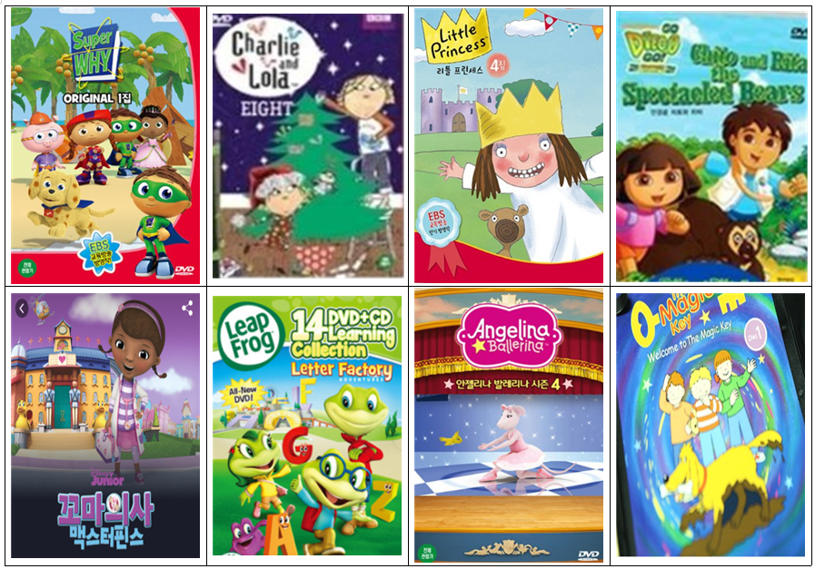 엄마표 영어의 많은 책들이 많은 DVD를 소개합니다. 제가 찾아보고 엄마표 영어를 해본 결과, 편하게 구할 수 없는 DVD도 많았습니다. 시간이 부족한 제가 낸 효율적인 방법은, 도서관에서 쉽게 구할 수 있는 DVD를 먼저 섭렵하는 것입니다. DVD는 가격대가 어느 정도 되고, 낱장으로 구매할 수 없으며, 또 자주 바꾸어서 틀어줘야 하기 때문에 비용적으로 부담이 될 수 있습니다. 영어 원서와 어린이 DVD를 소장하고 있는 대부분 도서관들은 유명한 DVD들은 가지고 있습니다. 제가 도서관을 통해 대여해서 본 DVD입니다.