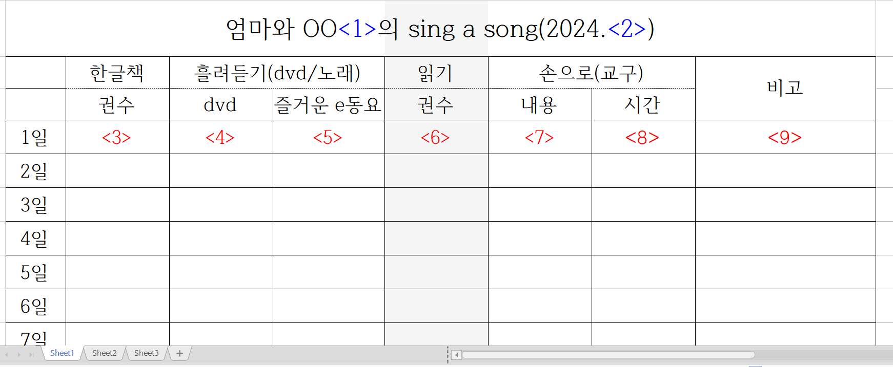 1. <1>의 OO 부분: 아이의 이름이나 애칭을 기재합니다. 아이가 자기의 이름이 예쁘게 들어가 있는 것을 좋아합니다. 그리고 이 계획표를 잘 보이는 곳에 붙이기 전에 아이이게 엄마와의 즐거운 시간을 기록해서 추억을 남기는 것이라고 설명합니다. 저도 6~7세에 아이와 실행했던 계획점검표를 가지고 있는데, 보고 있으면 괜히 뿌듯합니다. sing a song 부분은 원하는 대로 바꾸셔도 좋습니다. 귀찮으시면 그냥 쓰셔도 좋겠지요?