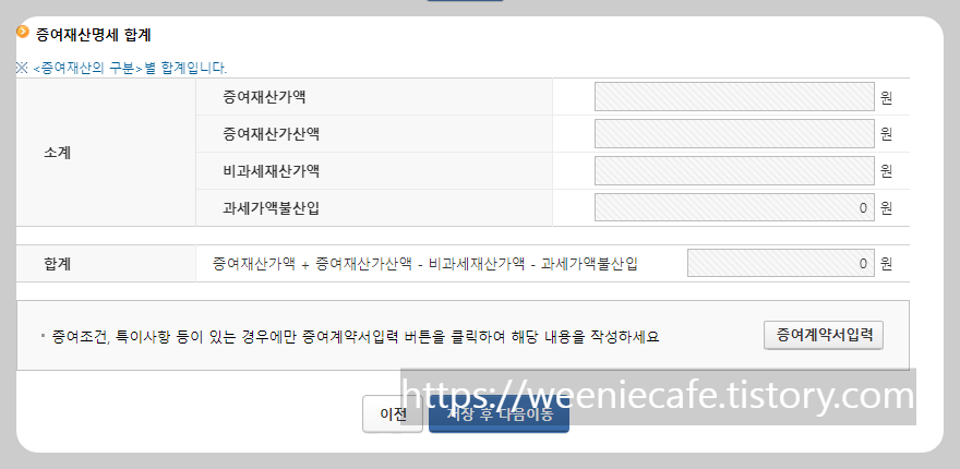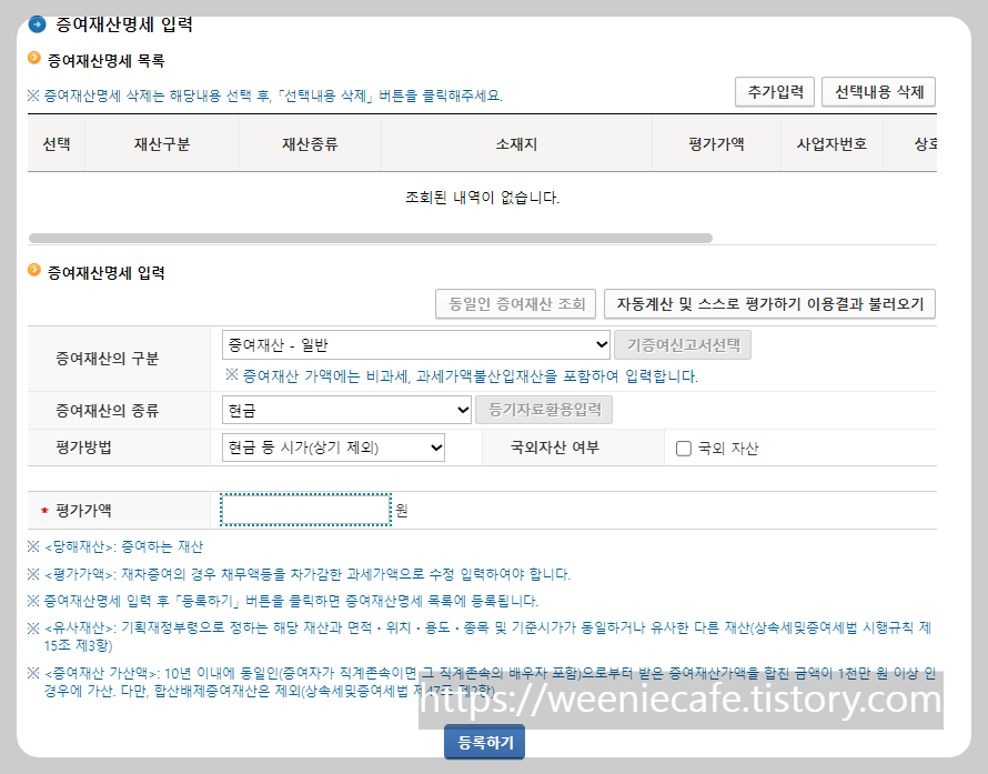 5. 4의 등록하기를 누르면 증여 재산명세 합계가 자동 입력됩니다.