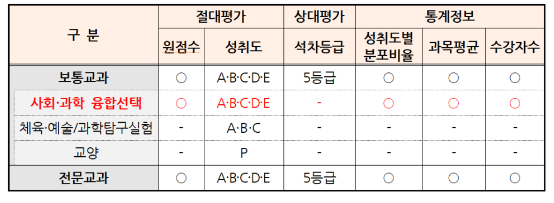 과목별 절대평가와 상대평가 성적을 함께 기재하지만, 대입에서 상대평가 성적이 활용되므로 사실상 현재와 같이 상대평가입니다. 다만, 고등학교 사회·과학 교과의 융합선택과목 9개 과목과 체육/예술/과학탐구실험/교양 과목은 절대평가만을 실시합니다.