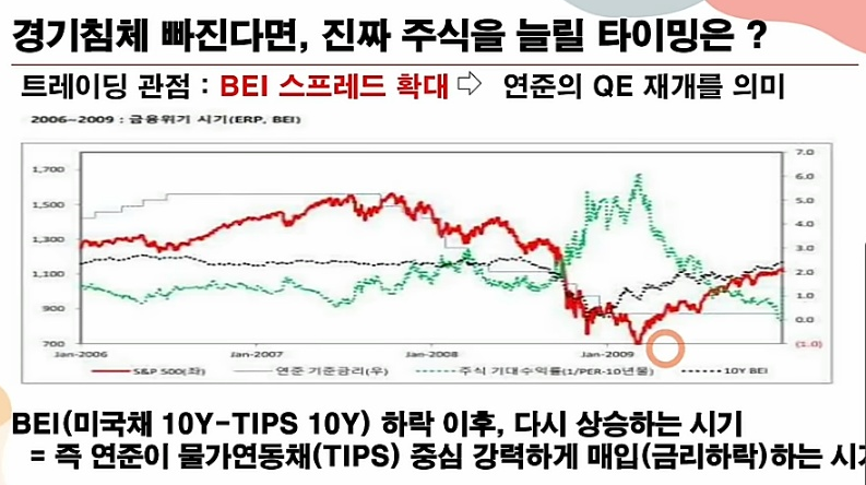 (3) 주식을 늘릴 타이밍은(만약 경기침체고 주가가 하락한다면), BEI 하락 이후 다시 상승하는 시기입니다. 이는 연준의 QE 재개를 의미하기 때문입니다.